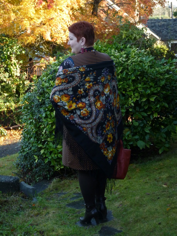 Here, I wear my new dress with old beloved pieces - my silk floral blouse (thrifted) and one of my Russian shawls (which was labeled as a "Russian table cloth" at a local antique mall), earrings which remind me of a bunch of berries, found for $4 or so earlier this year.